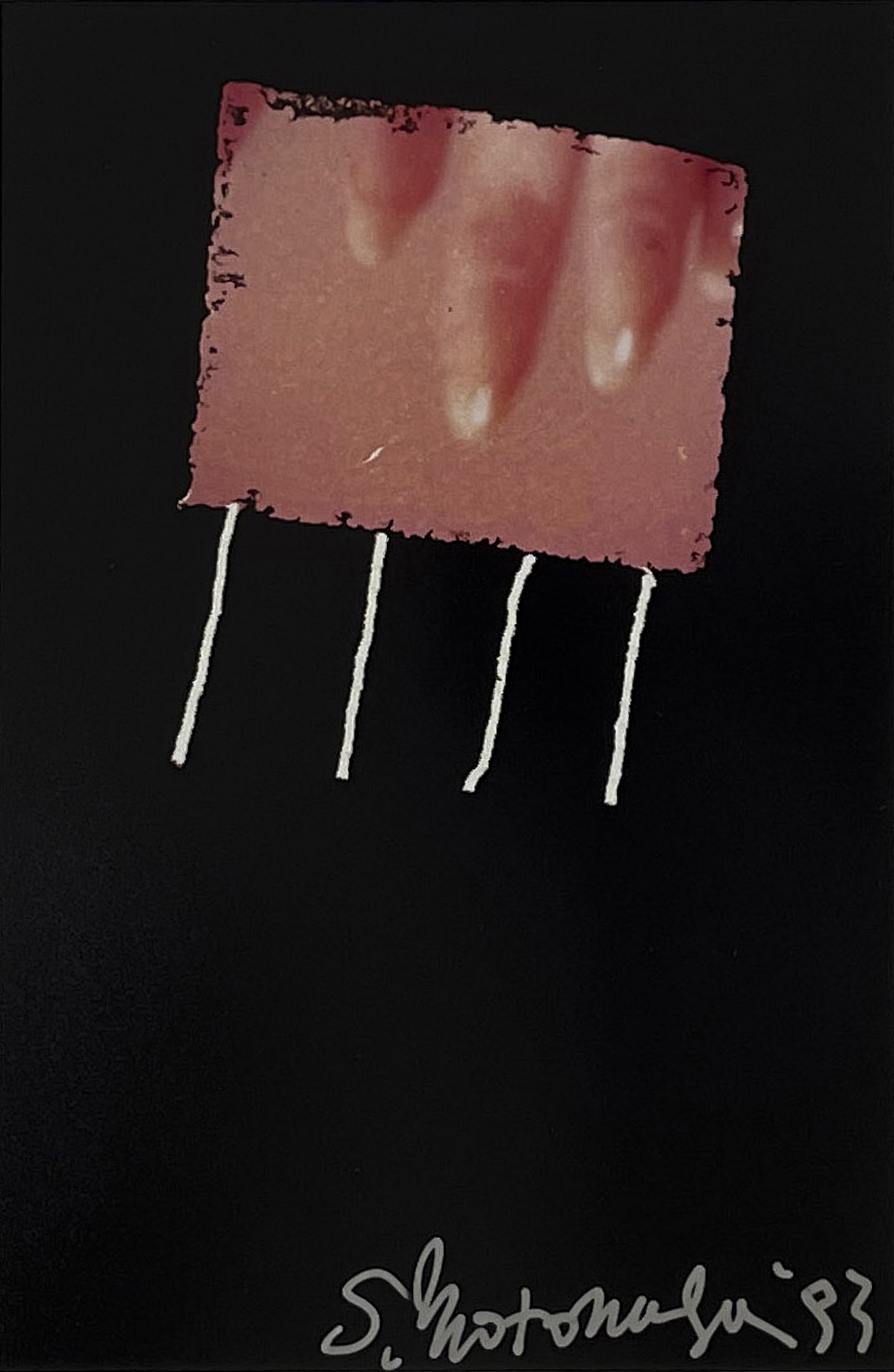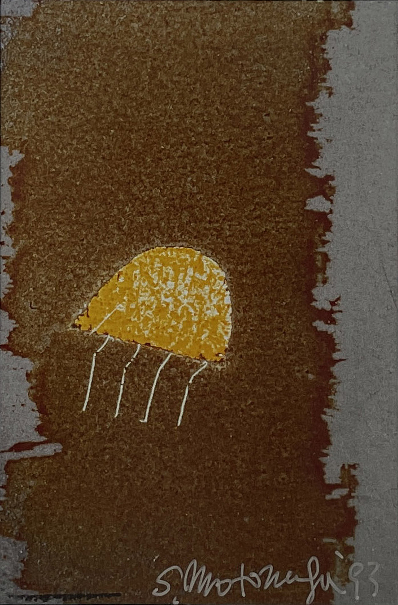 In 1954, he began employing a vocabulary of embryonic shapes, flying objects, and cartoon-like forms, modeled in heavy oil paint, that revealed his interest in children’s art, manga, and popular culture, and collapsed distinctions between high and low art. By 1957, Motonaga’s work had become more abstract and featured flowing lines and pools of brightly colored pigment poured and dripped onto the canvas. This “classic style,” which developed concurrently with Morris Louis’s Veil paintings, occupied Motonaga until the mid-1960s, when his anthropomorphic sensibility returned in paintings featuring extruded and knotted forms that were delicately modeled with airbrush.